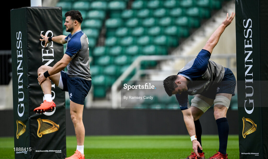 22 February 2020; Robbie Henshaw, left, and James Ryan during the Ireland Rugby Captain's Run at Twickenham Stadium in London, England. Photo by Ramsey Cardy/Sportsfile
