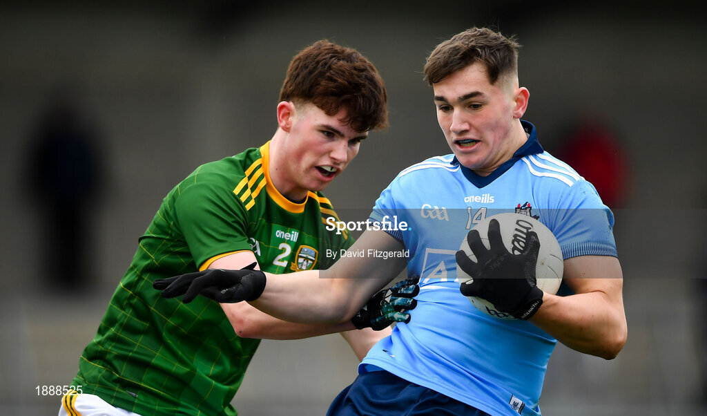 22 February 2020; Luke Swan of Dublin in action against Michael Gavin of Meath during the Eirgrid Leinster GAA Football U20 Championship Semi-Final match between Dublin and Meath at Parnell Park in Dublin. Photo by David Fitzgerald/Sportsfile