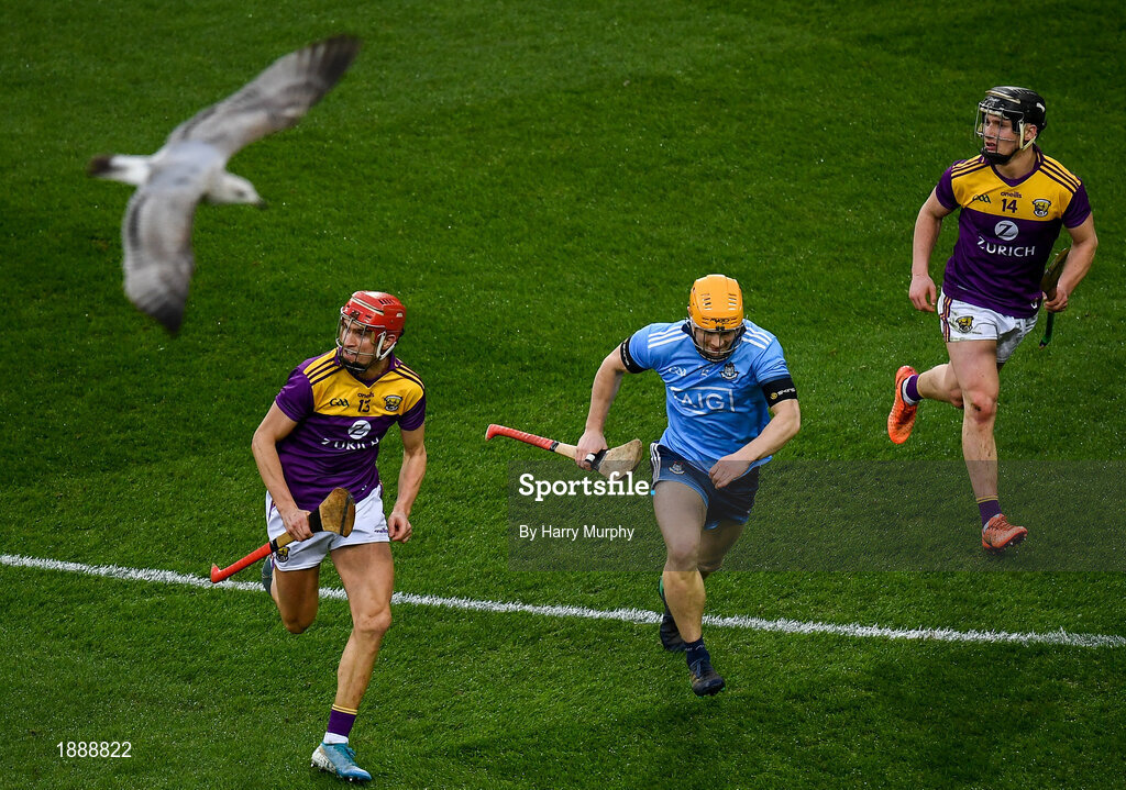 22 February 2020; Cian O’Callaghan of Dublin in action against Paul Morris and Michael Dwyer of Wexford as a seagull flies during the Allianz Hurling League Division 1 Group B Round 4 match between Dublin and Wexford at Croke Park in Dublin. Photo by Harry Murphy/Sportsfile