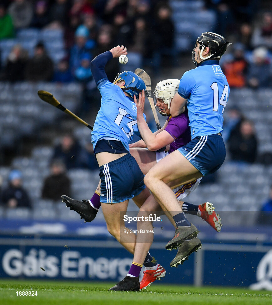 22 February 2020; Oisín O’Rorke, left, and Ronan Hayes of Dublin contest a high ball with Liam Ryan of Wexford during the Allianz Hurling League Division 1 Group B Round 4 match between Dublin and Wexford at Croke Park in Dublin. Photo by Sam Barnes/Sportsfile