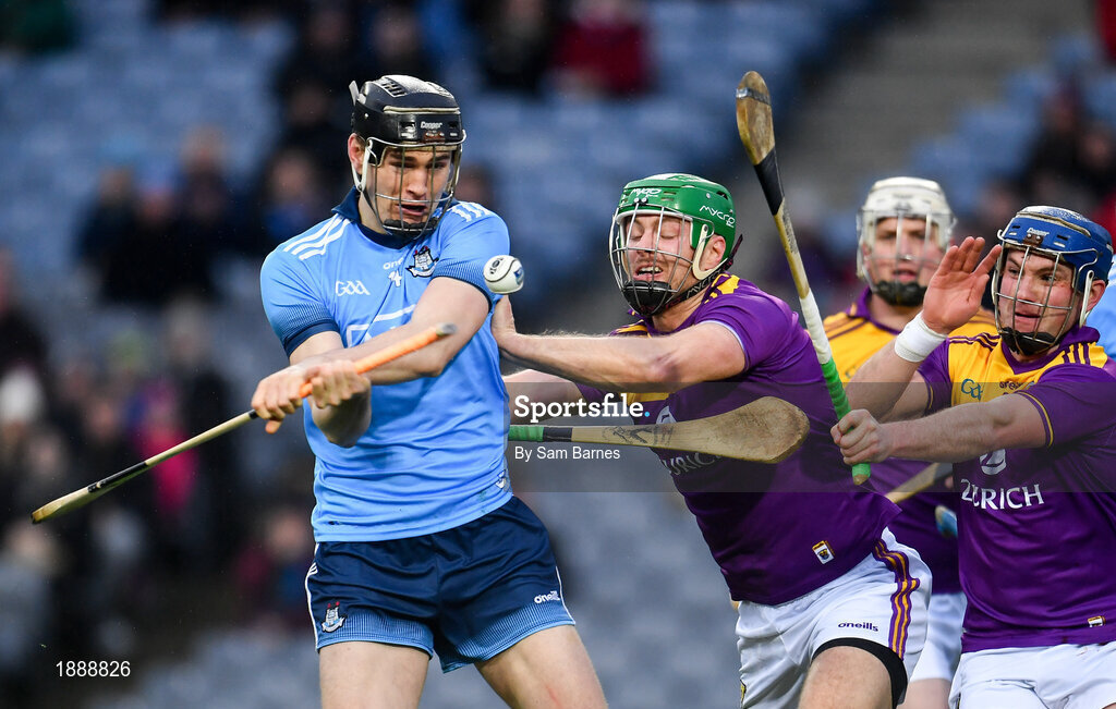 22 February 2020; Ronan Hayes of Dublin gets a shot away under pressure from Matthew O’Hanlon, centre, and Kevin Foley of Wexford during the Allianz Hurling League Division 1 Group B Round 4 match between Dublin and Wexford at Croke Park in Dublin. Photo by Sam Barnes/Sportsfile