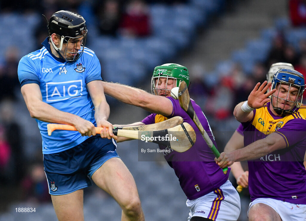 22 February 2020; Ronan Hayes of Dublin gets a shot away under pressure from Matthew O’Hanlon, centre, and Kevin Foley of Wexford during the Allianz Hurling League Division 1 Group B Round 4 match between Dublin and Wexford at Croke Park in Dublin. Photo by Sam Barnes/Sportsfile