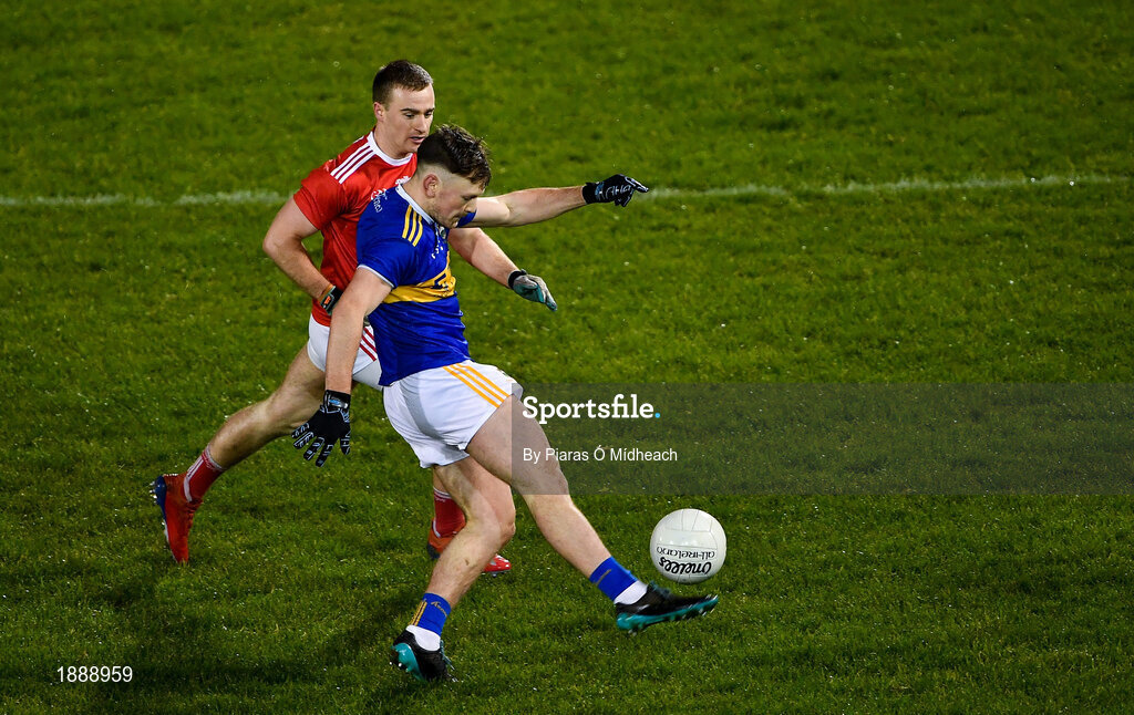 22 February 2020; Emmet Moloney of Tipperary kicks a point under pressure from Mattie Taylor of Cork during the Allianz Football League Division 3 Round 4 match between Tipperary and Cork at Semple Stadium in Thurles, Tipperary. Photo by Piaras Ó Mídheach/Sportsfile