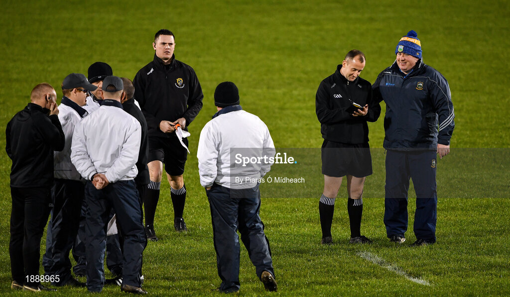 22 February 2020; Referee Brendan Cawley with Tipperary manager David Power before the Allianz Football League Division 3 Round 4 match between Tipperary and Cork at Semple Stadium in Thurles, Tipperary. Photo by Piaras Ó Mídheach/Sportsfile