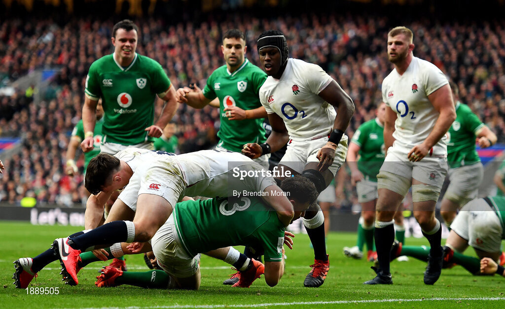 23 February 2020; Robbie Henshaw of Ireland on his way to scoring his side's first try despite the tackle of Ben Youngs of England during the Guinness Six Nations Rugby Championship match between England and Ireland at Twickenham Stadium in London, England. Photo by Brendan Moran/Sportsfile Photo by Brendan Moran/Sportsfile