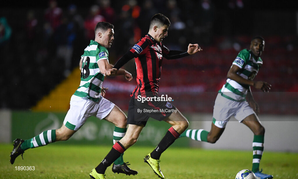 22 February 2020; Rob Manley of Longford Town in action against Sean Callan of Shamrock Rovers II during the SSE Airtricity League First Division match between Longford Town and Shamrock Rovers II at Bishopsgate in Longford. Photo by Stephen McCarthy/Sportsfile