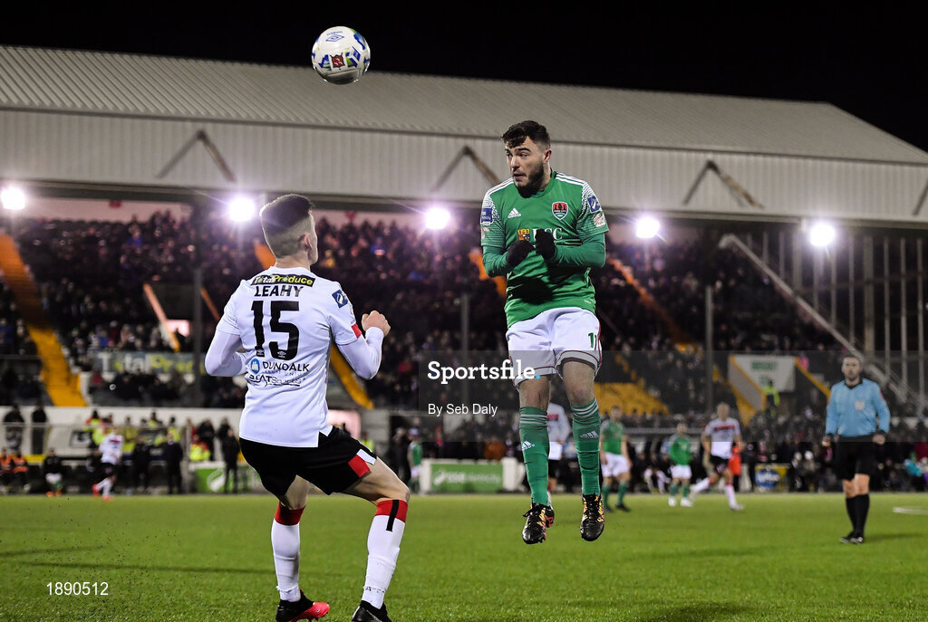 24 February 2020; Cory Galvin of Cork City in action against Darragh Leahy of Dundalk during the SSE Airtricity League Premier Division match between Dundalk and Cork City at Oriel Park in Dundalk, Louth. Photo by Seb Daly/Sportsfile