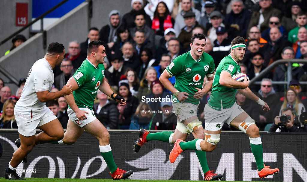 23 February 2020; Caelan Doris of Ireland makes a break, supported by team-mates Rónan Kelleher and James Ryan, during the Guinness Six Nations Rugby Championship match between England and Ireland at Twickenham Stadium in London, England. Photo by Brendan Moran/Sportsfile