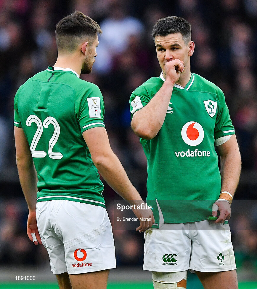 23 February 2020; Jonathan Sexton, right, and Ross Byrne of Ireland during the Guinness Six Nations Rugby Championship match between England and Ireland at Twickenham Stadium in London, England. Photo by Brendan Moran/Sportsfile