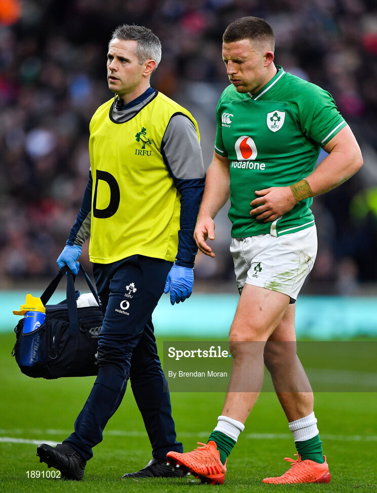 23 February 2020; Andrew Conway of Ireland leaves the pitch accompanied by Team doctor Dr Ciaran Cosgrave during the Guinness Six Nations Rugby Championship match between England and Ireland at Twickenham Stadium in London, England. Photo by Brendan Moran/Sportsfile
