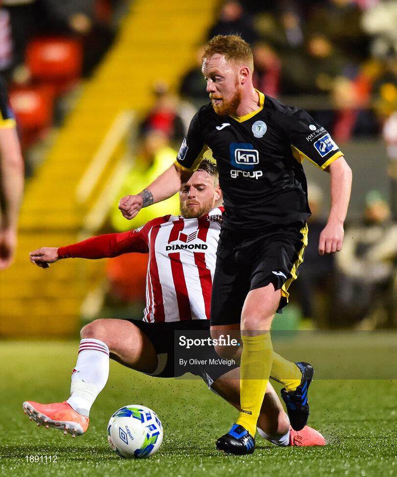 21 February 2020; Ryan Connolly of Finn Harps in action against Conor Clifford of Derry City during the SSE Airtricity League Premier Division match between Derry City and Finn Harps at Ryan McBride Brandywell Stadium in Derry. Photo by Oliver McVeigh/Sportsfile