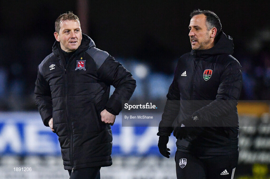 24 February 2020; Dundalk head coach Vinny Perth, left, and Cork City manager Neale Fenn ahead of the SSE Airtricity League Premier Division match between Dundalk and Cork City at Oriel Park in Dundalk, Louth. Photo by Ben McShane/Sportsfile