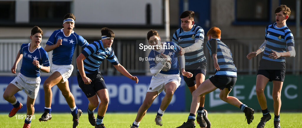 25 February 2020; Evan Moynihan of St Mary’s College is tackled by Daniel Ruane of St Vincent’s Castleknock College during the Bank of Ireland Leinster Schools Junior Cup Second Round match between St Vincent’s Castleknock College and St Mary’s College at Energia Park in Dublin. Photo by Daire Brennan/Sportsfile