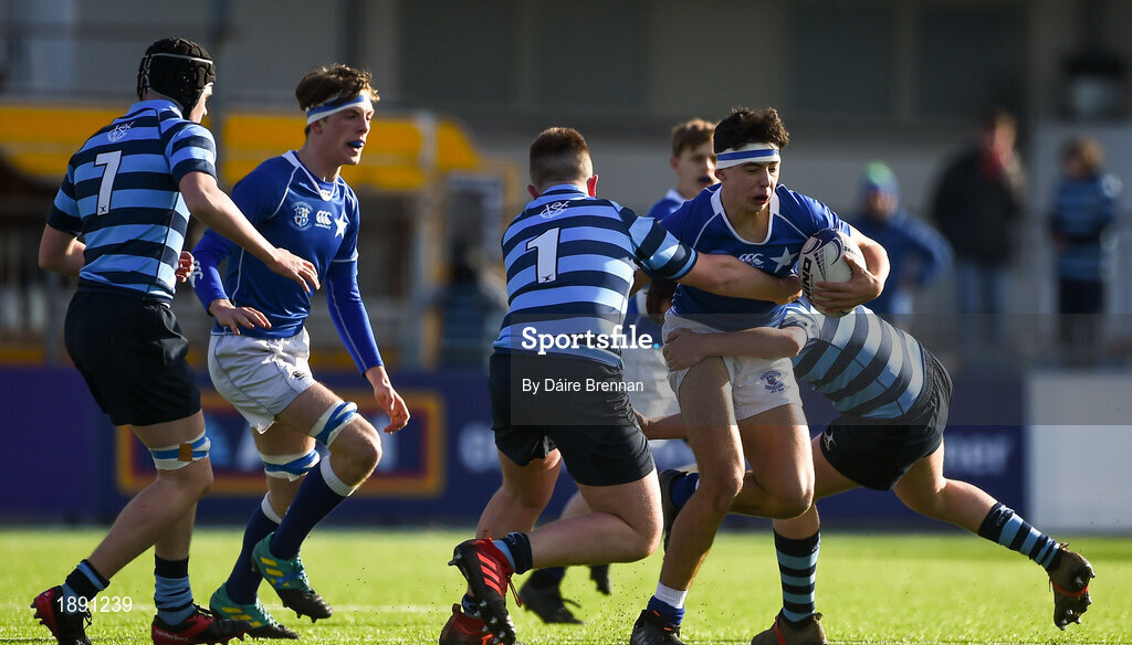 25 February 2020; Aaron O’Brien of St Mary’s College is tackled by Billy Dowling, left, and Sean Mahon of St Vincent’s Castleknock College during the Bank of Ireland Leinster Schools Junior Cup Second Round match between St Vincent’s Castleknock College and St Mary’s College at Energia Park in Dublin. Photo by Daire Brennan/Sportsfile