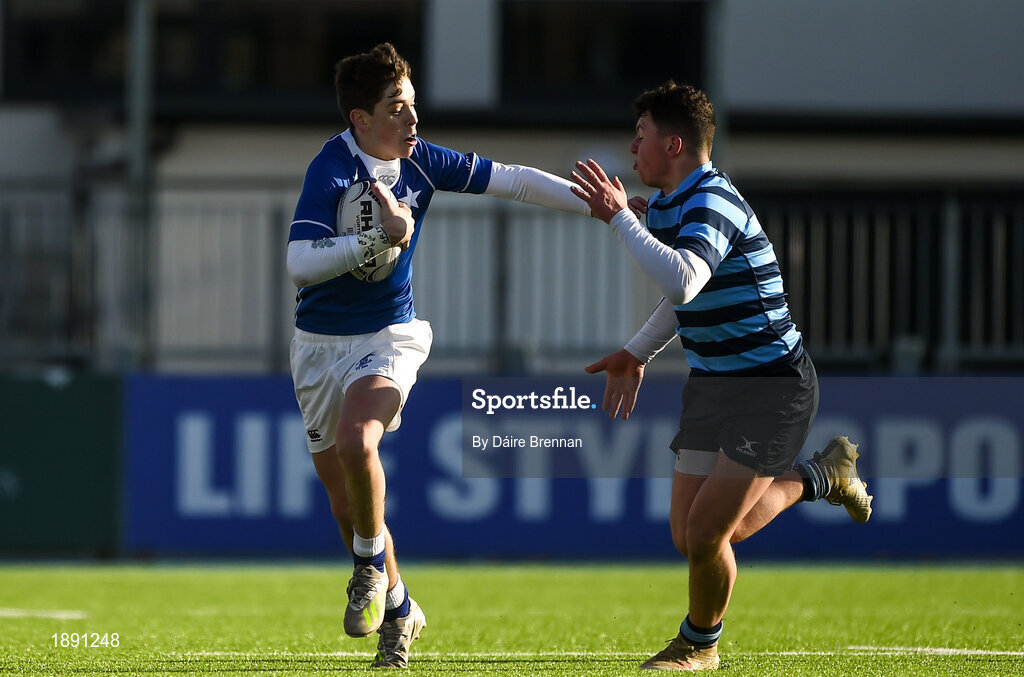 25 February 2020; Evan Moynihan of St Mary’s College is tackled by Sam Wisniewski of St Vincent’s Castleknock College during the Bank of Ireland Leinster Schools Junior Cup Second Round match between St Vincent’s Castleknock College and St Mary’s College at Energia Park in Dublin. Photo by Daire Brennan/Sportsfile