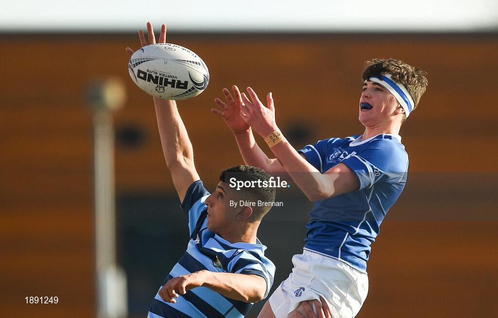 25 February 2020; Wali Khwaja of St Vincent’s Castleknock College contests a line-out against Lucca Jennings of St Mary’s College during the Bank of Ireland Leinster Schools Junior Cup Second Round match between St Vincent’s Castleknock College and St Mary’s College at Energia Park in Dublin. Photo by Daire Brennan/Sportsfile