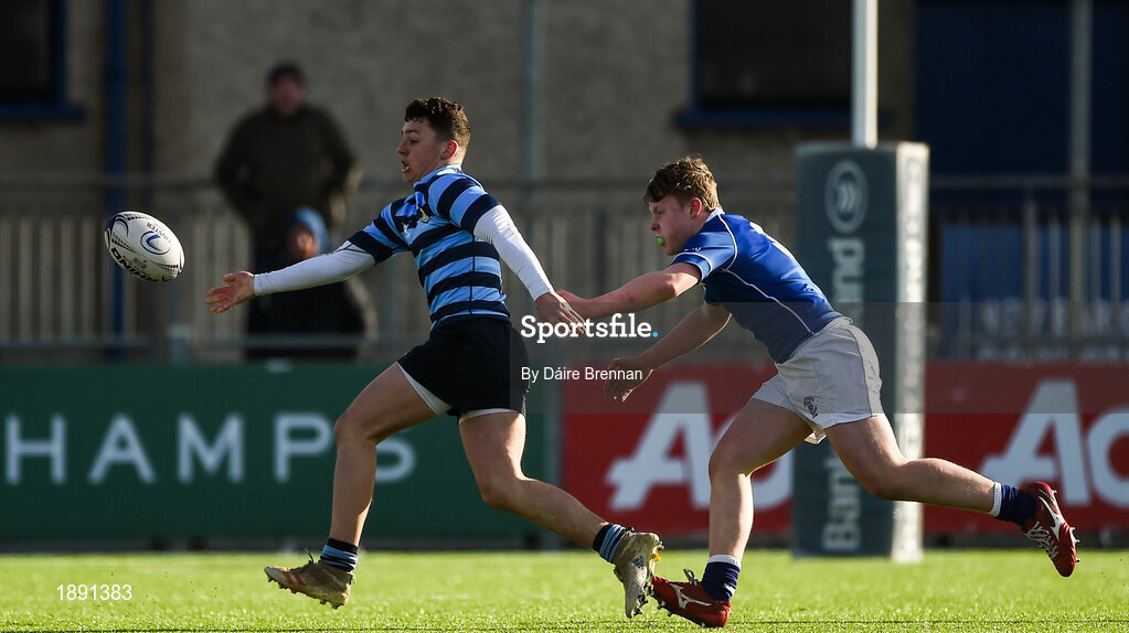 25 February 2020; Sam Wisniewski of St Vincent’s Castleknock College is tackled by Ruadhán Smyth of St Mary’s College during the Bank of Ireland Leinster Schools Junior Cup Second Round match between St Vincent’s Castleknock College and St Mary’s College at Energia Park in Dublin. Photo by Daire Brennan/Sportsfile