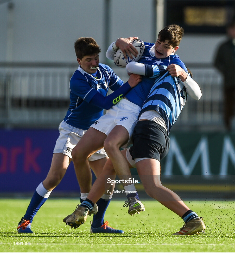 25 February 2020; Evan Moynihan of St Mary’s College is tackled by Sam Wisniewski of St Vincent’s Castleknock College during the Bank of Ireland Leinster Schools Junior Cup Second Round match between St Vincent’s Castleknock College and St Mary’s College at Energia Park in Dublin. Photo by Daire Brennan/Sportsfile
