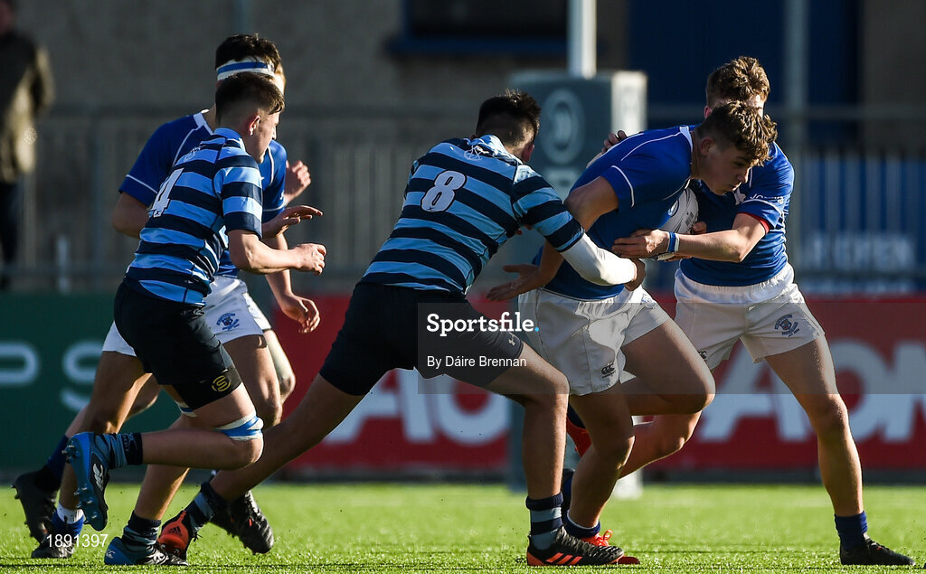 25 February 2020; Andrew Sparrow of St Mary’s College is tackled by Daniel Ruane of St Vincent’s Castleknock College during the Bank of Ireland Leinster Schools Junior Cup Second Round match between St Vincent’s Castleknock College and St Mary’s College at Energia Park in Dublin. Photo by Daire Brennan/Sportsfile