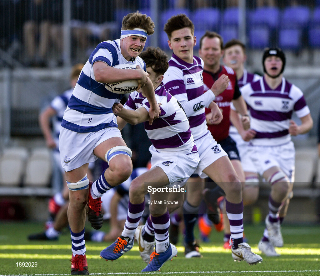 27 February 2020; Michael Colreavy of Blackrock College is tackled by Sam Pinel of Clongowes Wood College during the Bank of Ireland Leinster Schools Junior Cup Second Round match between Blackrock College and Clongowes Wood College at Energia Park in Dublin. Photo by Matt Browne/Sportsfile