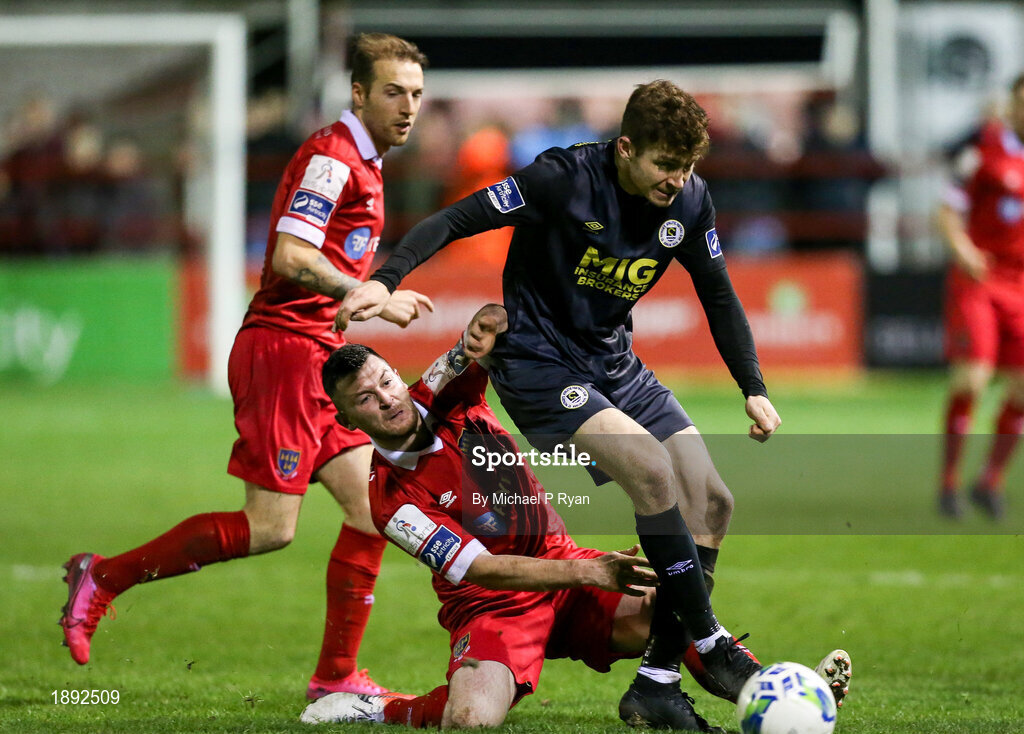 28 February 2020; Ryan Brennan of Shelbourne in action against Rory Feely of St Patrick's Athletic during the SSE Airtricity League Premier Division match between Shelbourne and St Patrick's Athletic at Tolka Park in Dublin. Photo by Michael P Ryan/Sportsfile