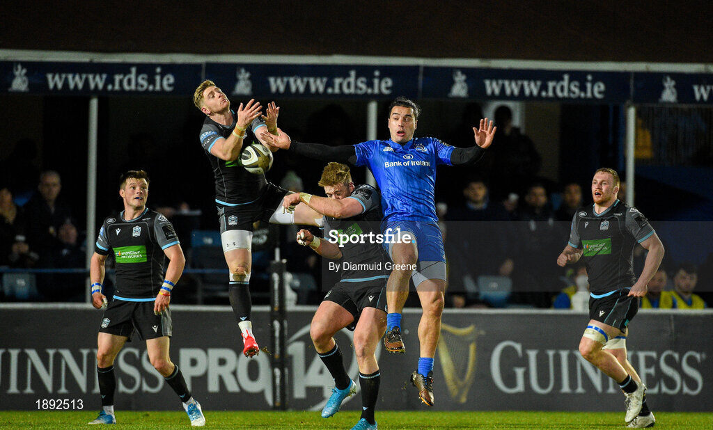 28 February 2020; Kyle Steyn of Glasgow Warriors in action against James Lowe of Leinster during the Guinness PRO14 Round 13 match between Leinster and Glasgow Warriors at the RDS Arena in Dublin. Photo by Diarmuid Greene/Sportsfile