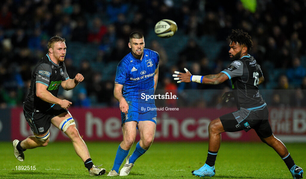 28 February 2020; Harry Byrne of Leinster in action against Tom Gordon and Niko Matawalu of Glasgow Warriors during the Guinness PRO14 Round 13 match between Leinster and Glasgow Warriors at the RDS Arena in Dublin. Photo by Diarmuid Greene/Sportsfile