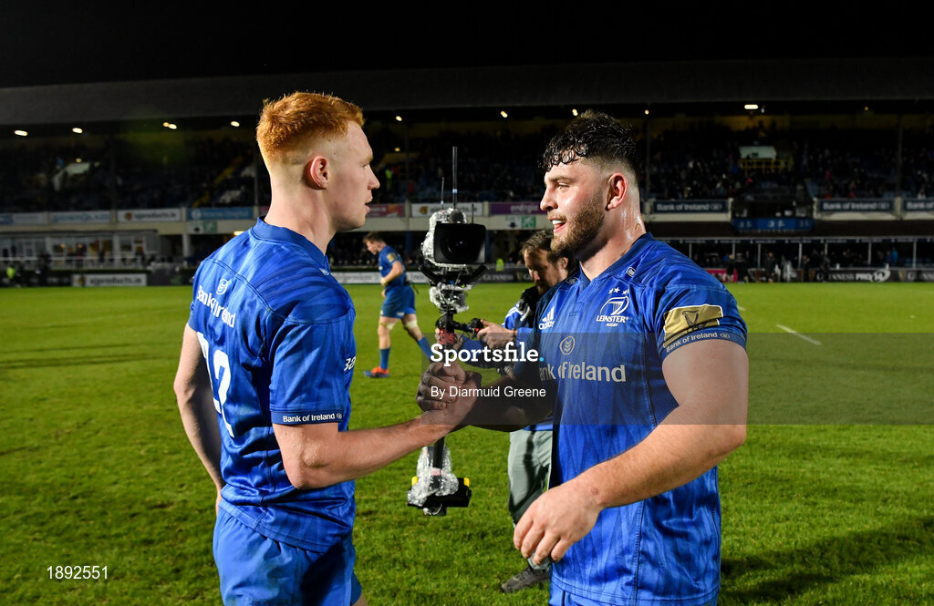 28 February 2020; Ciarán Frawley and Michael Milne of Leinster celebrate after the Guinness PRO14 Round 13 match between Leinster and Glasgow Warriors at the RDS Arena in Dublin. Photo by Diarmuid Greene/Sportsfile