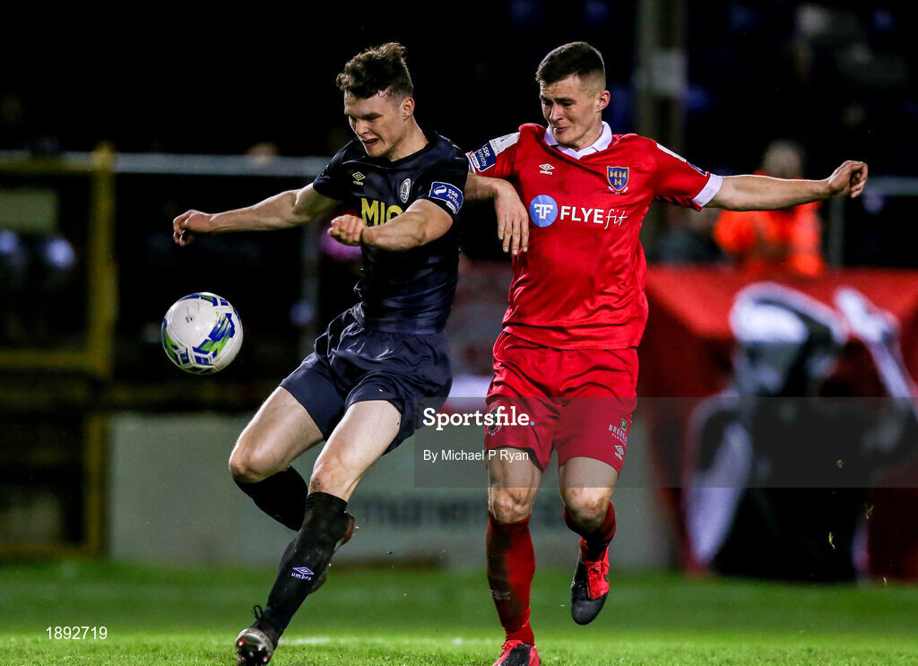 28 February 2020; Luke McNally of St Patrick's Athletic in action against Aaron Dobbs of Shelbourne during the SSE Airtricity League Premier Division match between Shelbourne and St Patrick's Athletic at Tolka Park in Dublin. Photo by Michael P Ryan/Sportsfile