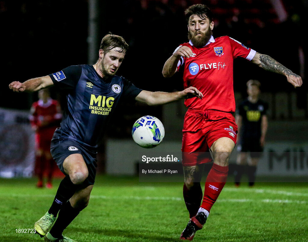28 February 2020; Billy King of St Patrick's Athletic of St Patrick's Athletic in action against Gary Deegan of Shelbourne during the SSE Airtricity League Premier Division match between Shelbourne and St Patrick's Athletic at Tolka Park in Dublin. Photo by Michael P Ryan/Sportsfile