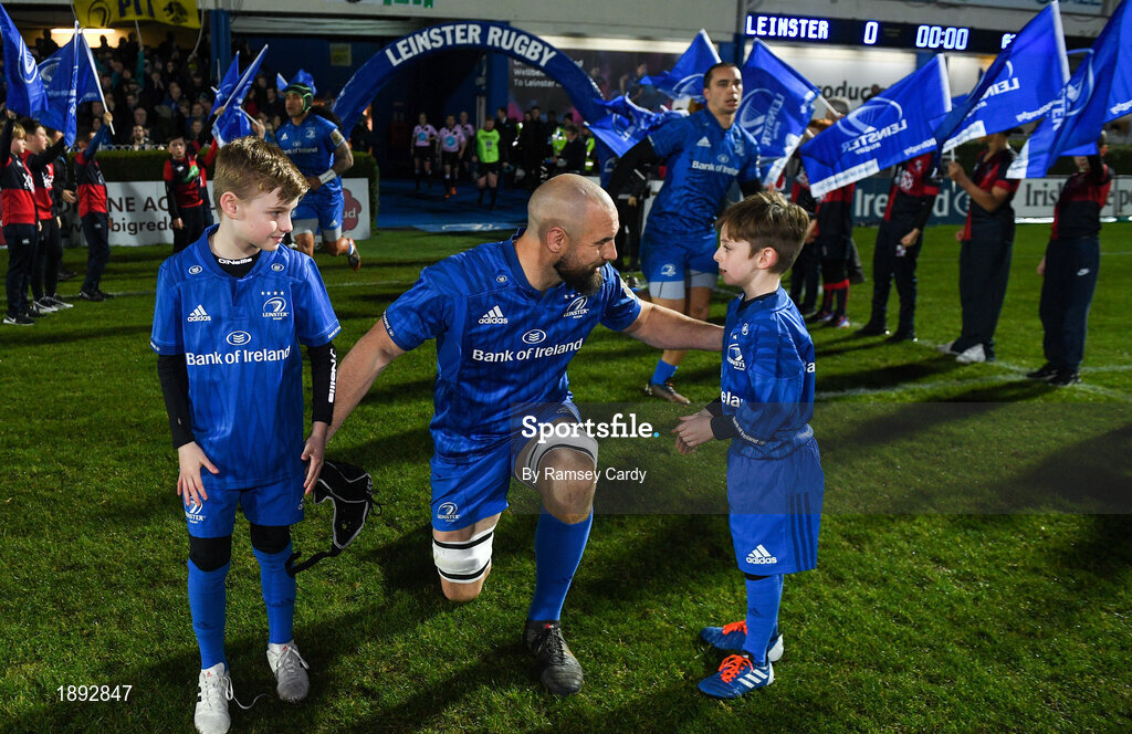 28 February 2020; Leinster captain Scott Fardy with matchday mascots 9 year old Rory Doran, and 8 year old Tom Crowe, ahead of the Guinness PRO14 Round 13 match between Leinster and Glasgow Warriors at the RDS Arena in Dublin. Photo by Ramsey Cardy/Sportsfile