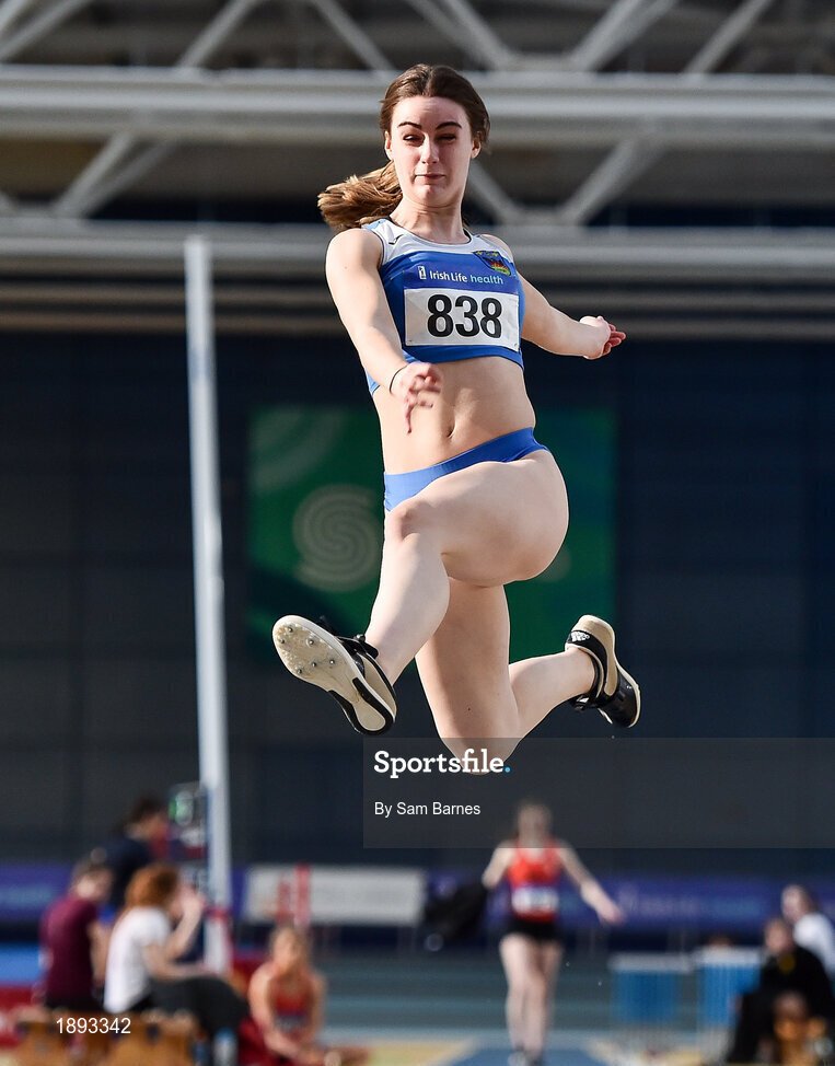 29 February 2020; Katelyn Farrelly of Tullamore Harriers AC, Offaly, competing in the Senior Women's Long Jump event during day one of the Irish Life Health National Senior Indoor Athletics Championships at the National Indoor Arena in Abbotstown in Dublin. Photo by Sam Barnes/Sportsfile