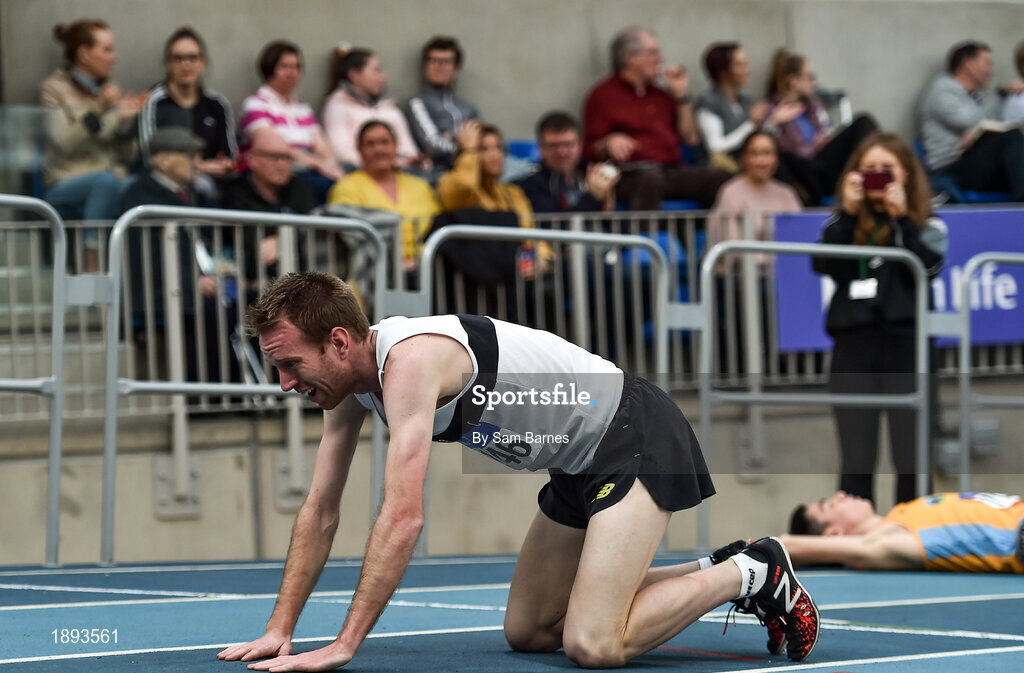1 March 2020; John Travers of Donore Harriers, Dublin, after winning the Senior Men's 3000m event during Day Two of the Irish Life Health National Senior Indoor Athletics Championships at the National Indoor Arena in Abbotstown in Dublin. Photo by Sam Barnes/Sportsfile