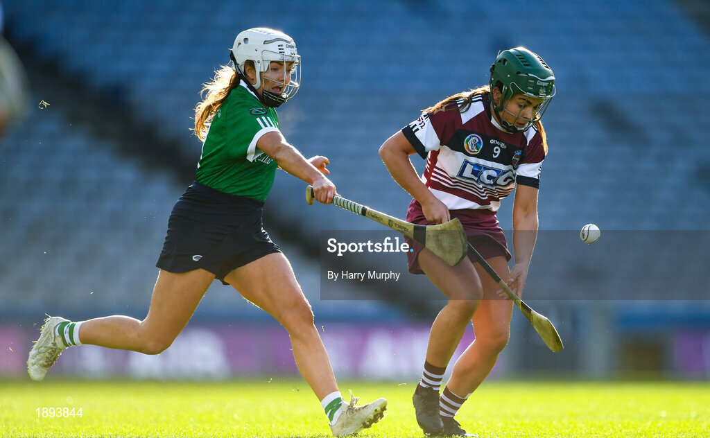 1 March 2020; Shannon Graham of Slaughtneil in action against Clodagh McGrath of Sarsfields during the AIB All-Ireland Senior Camogie Club Championship Final match between Sarsfields and Slaughtneil at Croke Park in Dublin. Photo by Harry Murphy/Sportsfile