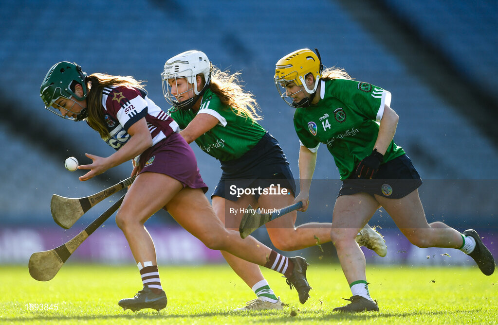 1 March 2020; Shannon Graham of Slaughtneil in action against Clodagh McGrath and Siobhán McGrath of Sarsfields during the AIB All-Ireland Senior Camogie Club Championship Final match between Sarsfields and Slaughtneil at Croke Park in Dublin. Photo by Harry Murphy/Sportsfile
