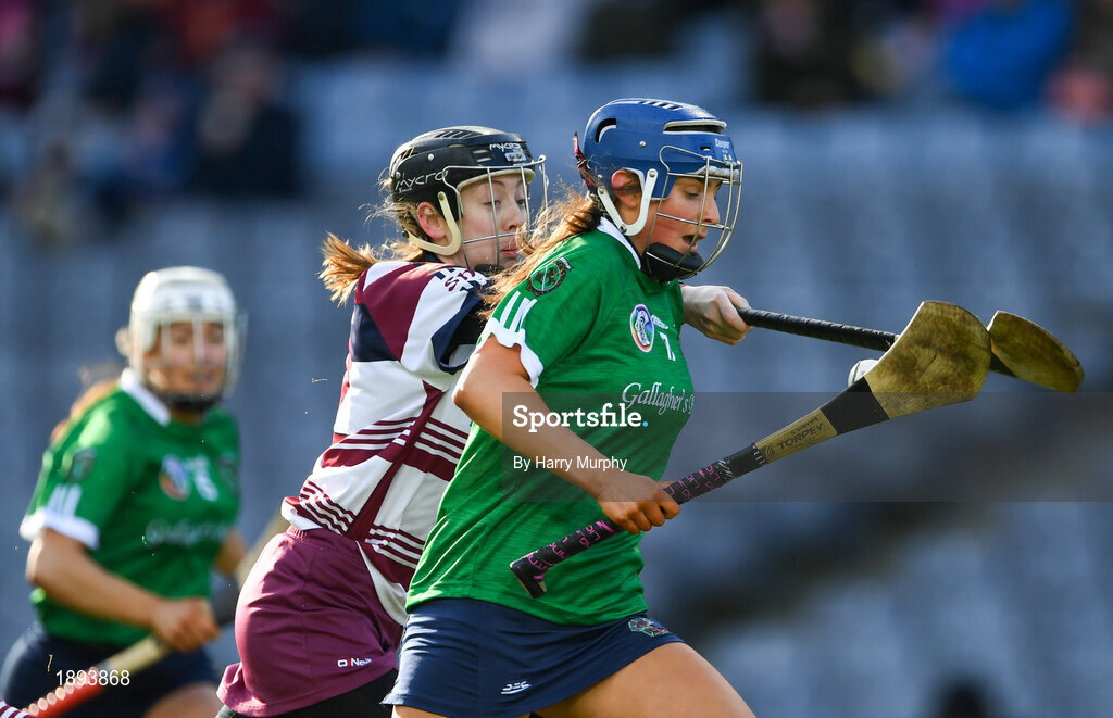 1 March 2020; Sheena Warde of Sarsfields in action against Louise Dougan of Slaughtneil during the AIB All-Ireland Senior Camogie Club Championship Final match between Sarsfields and Slaughtneil at Croke Park in Dublin. Photo by Harry Murphy/Sportsfile