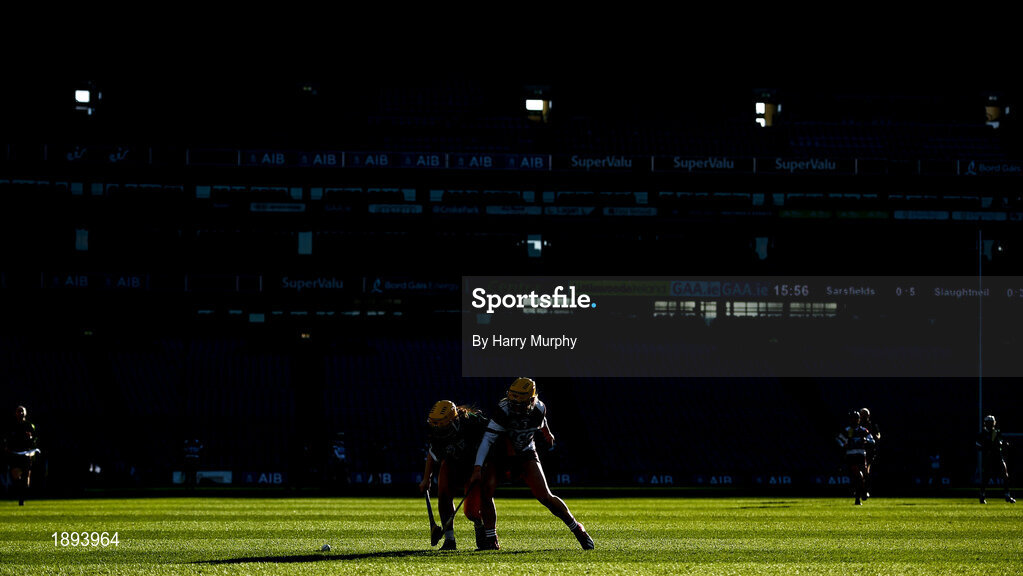 1 March 2020; A General view of Aoibhe Deeley of Sarsfields in action against Gráinne Ní Chatháin of Slaughtneil during the AIB All-Ireland Senior Camogie Club Championship Final match between Sarsfields and Slaughtneil at Croke Park in Dublin. Photo by Harry Murphy/Sportsfile
