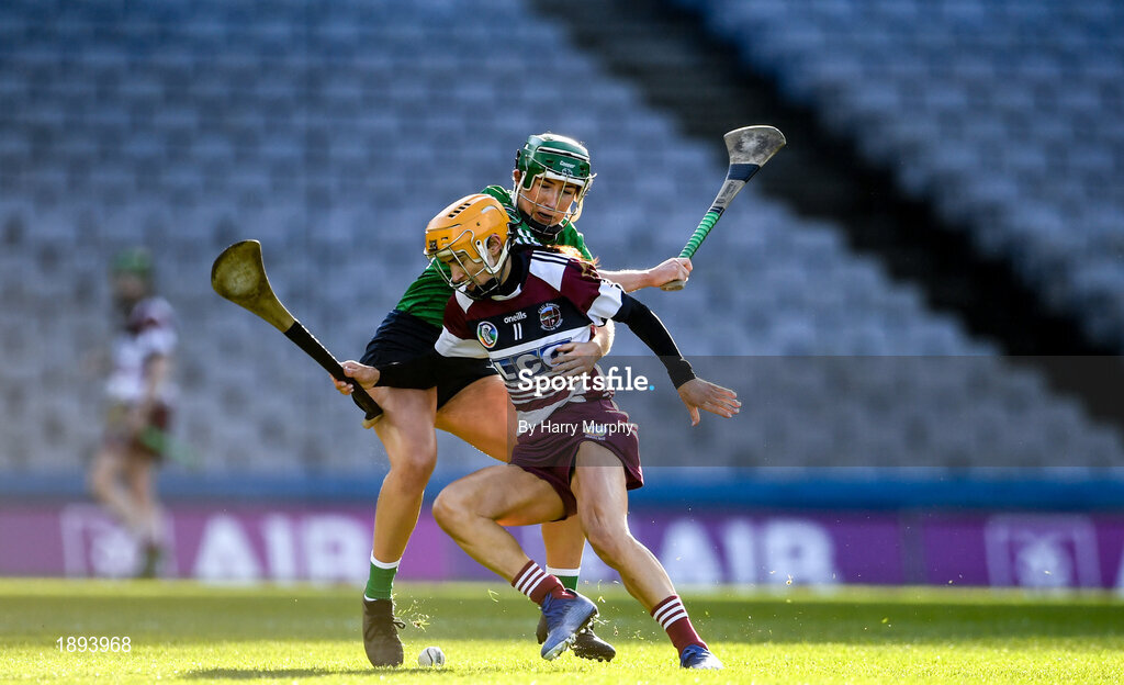 1 March 2020; Tina Bradley of Slaughtneil in action against Aoibhe Deeley of Sarsfields during the AIB All-Ireland Senior Camogie Club Championship Final match between Sarsfields and Slaughtneil at Croke Park in Dublin. Photo by Harry Murphy/Sportsfile