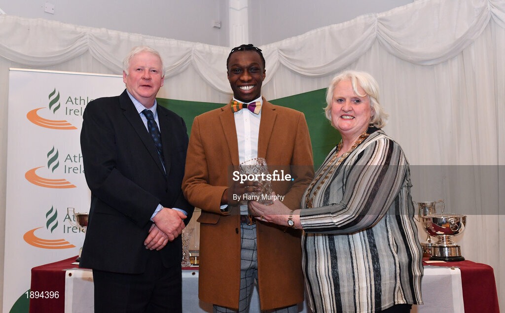 2 March 2020; Nelvin Appiah of Longford AC is presented his Star Award trophy by Chairperson of the Athletics Ireland Juvenile Committee John McGrath and President of Athletics Ireland Georgina Drumm during the Juvenile Star Awards 2019 at The Bridge Hotel in Tullamore, Offaly. Photo by Harry Murphy/Sportsfile