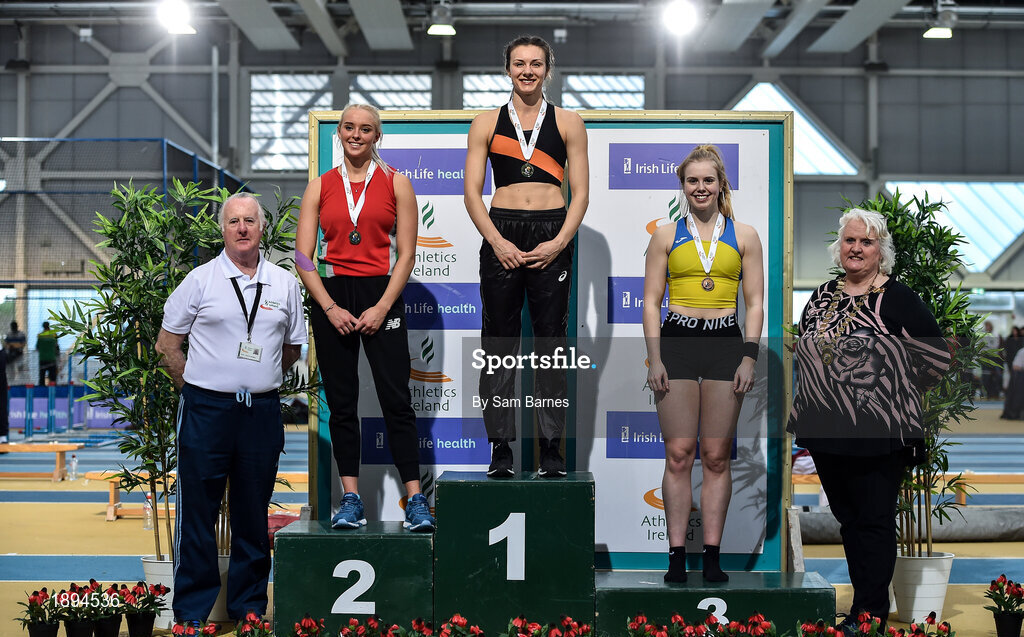1 March 2020; Athletics Ireland President Georgina Drumm, right, with Senior Women's Pole Vault medallists, from left, Ellen McCartney of City of Lisburn AC, Down, silver, Ariel Elizabeth Lieghio of Clonliffe Harriers AC, Dublin, gold, and Clodagh Walsh of Abbey Striders AC, Cork, bronze, event during Day Two of the Irish Life Health National Senior Indoor Athletics Championships at the National Indoor Arena in Abbotstown in Dublin. Photo by Sam Barnes/Sportsfile