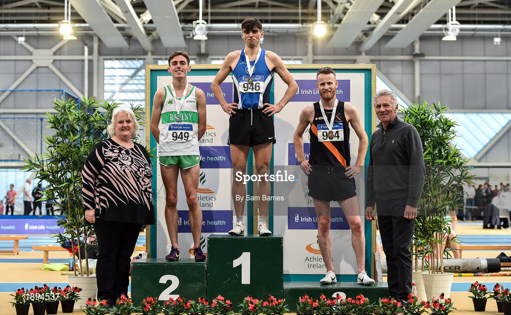 1 March 2020; Athletics Ireland President Georgina Drumm, left, and 3-time Olympian Eamonn Coghlan, right, with Senior Men's 1500m medallists, from left, Brian Fay of Raheny Shamrock AC, Dublin, silver, Andrew Coscoran of Star of the Sea AC, gold, and Eoin Pierce of Clonliffe Harriers AC, Dublin, bronze, during Day Two of the Irish Life Health National Senior Indoor Athletics Championships at the National Indoor Arena in Abbotstown in Dublin. Photo by Sam Barnes/Sportsfile