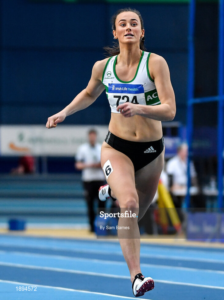 1 March 2020; Ciara Neville of Emerald AC, Limerick, competing in the Senior Women's 60m event during Day Two of the Irish Life Health National Senior Indoor Athletics Championships at the National Indoor Arena in Abbotstown in Dublin. Photo by Sam Barnes/Sportsfile
