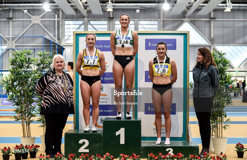 1 March 2020; Athletics Ireland President Georgian Drumm, left, and Liz Rowen, Head of Marketing for Irish life Health, with Senior Women's 60m medallists, from left, Joan Healy of Leevale AC, Cork, silver, Ciara Neville of Emerald AC, Limerick, gold, and Phil Healy of Bandon AC, Cork, bronze, during Day Two of the Irish Life Health National Senior Indoor Athletics Championships at the National Indoor Arena in Abbotstown in Dublin. Photo by Sam Barnes/Sportsfile