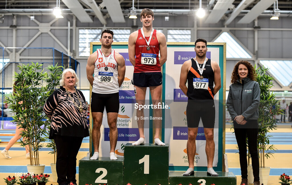 1 March 2020; Athletics Ireland President Georgina Drumm, left, and Liz Rowen, Head of Marketing for Irish life Health, with Senior Men's 400m medallists, from left, Andrew Mellon of Crusaders AC, Dublin, silver, Cathal Crosbie of Ennis Track AC, Clare, gold, and Brian Gregan of Clonliffe Harriers AC, Dublin, bronze, during Day Two of the Irish Life Health National Senior Indoor Athletics Championships at the National Indoor Arena in Abbotstown in Dublin. Photo by Sam Barnes/Sportsfile
