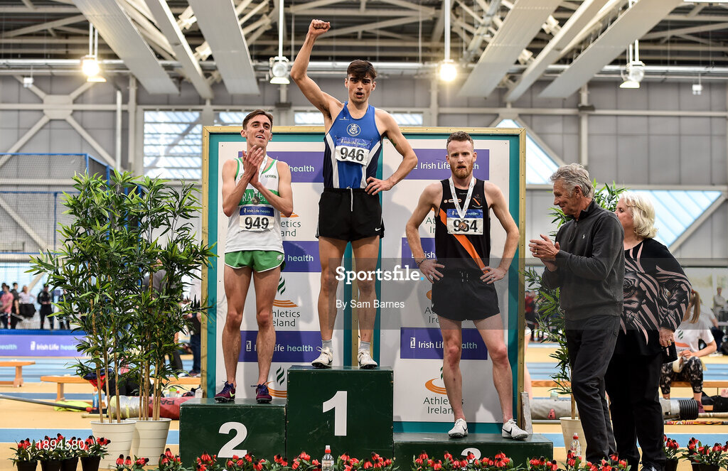 1 March 2020; Athletics Ireland President Georgina Drumm, right, and 3-time Olympian Eamonn Coghlan, second from right, with Senior Men's 1500m medallists, from left, Brian Fay of Raheny Shamrock AC, Dublin, silver, Andrew Coscoran of Star of the Sea AC, gold, and Eoin Pierce of Clonliffe Harriers AC, Dublin, bronze, during Day Two of the Irish Life Health National Senior Indoor Athletics Championships at the National Indoor Arena in Abbotstown in Dublin. Photo by Sam Barnes/Sportsfile