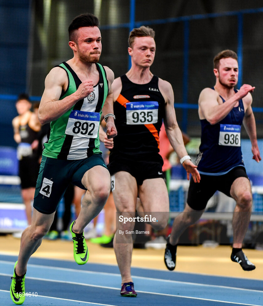 1 March 2020; Athletes, from left, Dean Adams of Ballymena and Antrim AC, Keith Pike of Clonliffe Harriers AC, Dublin and Connor Potts of University of Ulster Jordanstown, competing in the Senior Men's 60m event during Day Two of the Irish Life Health National Senior Indoor Athletics Championships at the National Indoor Arena in Abbotstown in Dublin. Photo by Sam Barnes/Sportsfile