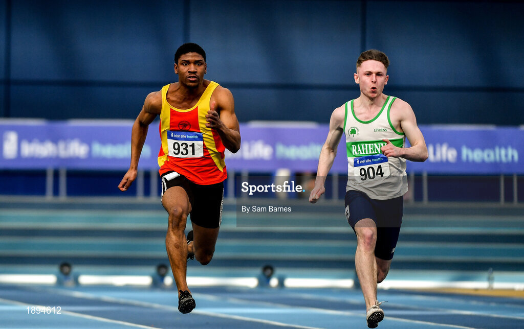 1 March 2020; Joseph Olalekan Ojemumi of Tallaght AC, Dublin, left, and Michael Farrelly of Raheny Shamrock AC, Dublin, competing in the Senior Men's 60m event during Day Two of the Irish Life Health National Senior Indoor Athletics Championships at the National Indoor Arena in Abbotstown in Dublin. Photo by Sam Barnes/Sportsfile