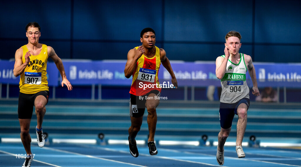 1 March 2020; Athletes, from left, Joe Gibson of Bandon AC, Cork, Joseph Olalekan Ojemumi of Tallaght AC, Dublin, and Michael Farrelly of Raheny Shamrock AC, Dublin, competing in the Senior Men's 60m event during Day Two of the Irish Life Health National Senior Indoor Athletics Championships at the National Indoor Arena in Abbotstown in Dublin. Photo by Sam Barnes/Sportsfile