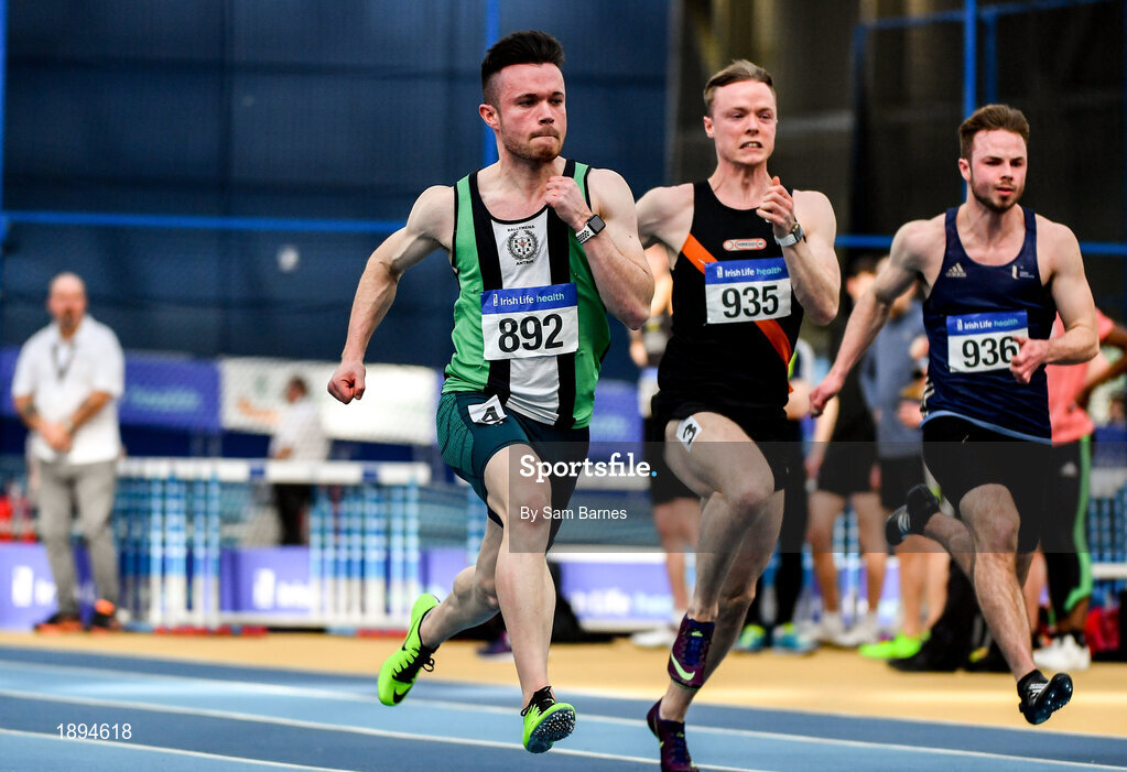 1 March 2020; Athletes, from left, Dean Adams of Ballymena and Antrim AC, Keith Pike of Clonliffe Harriers AC, Dublin and Connor Potts of University of Ulster Jordanstown, competing in the Senior Men's 60m event during Day Two of the Irish Life Health National Senior Indoor Athletics Championships at the National Indoor Arena in Abbotstown in Dublin. Photo by Sam Barnes/Sportsfile