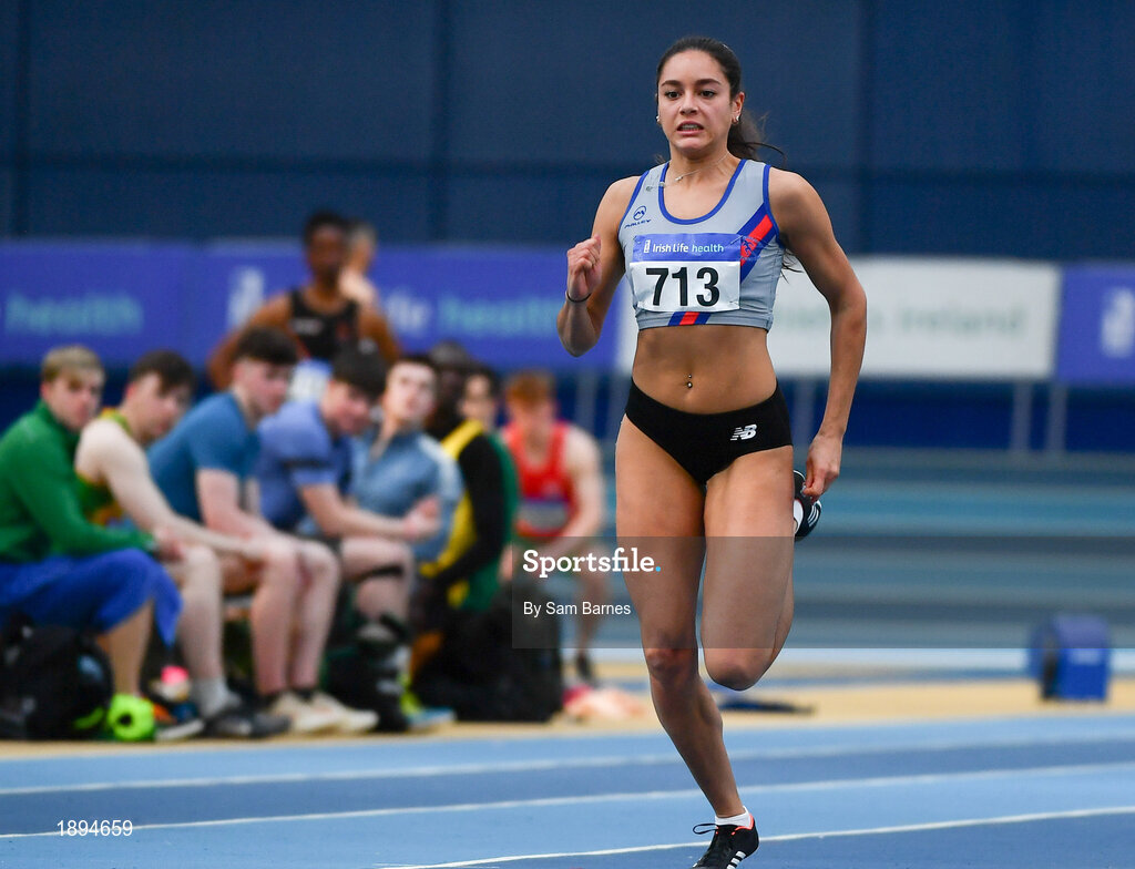1 March 2020; Kate Doherty of Dundrum South Dublin AC, competing in the Senior Women's 60m event during Day Two of the Irish Life Health National Senior Indoor Athletics Championships at the National Indoor Arena in Abbotstown in Dublin. Photo by Sam Barnes/Sportsfile